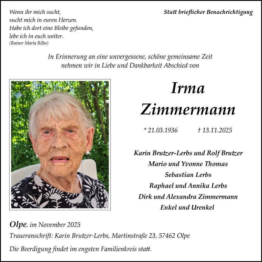 Irma Zimmermanngestorben am 13. November 2025